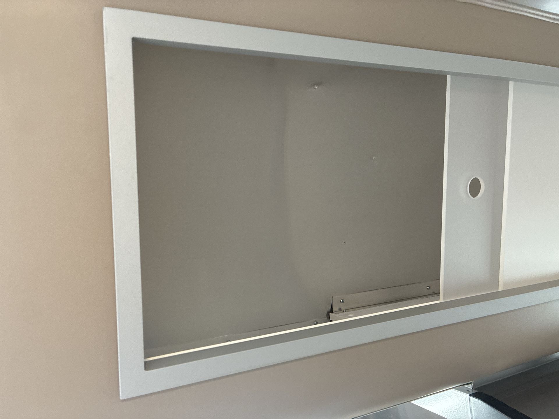 The bathroom, located at the rear, includes a spacious shower, a plastic toilet, and sufficient storage for toiletries and towels. With vinyl flooring throughout, cleaning is a breeze, allowing more time to enjoy your travels.
