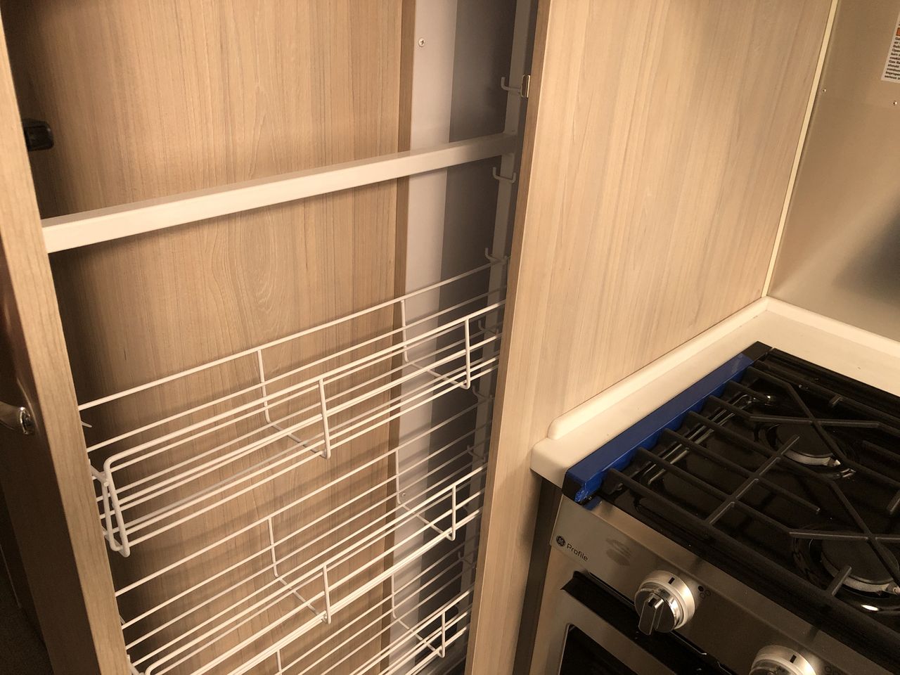 The living area includes a lounge space with a modern sofa and a dinette that converts into additional sleeping quarters. High-quality cabinetry and soft-close drawers offer ample storage. The fully equipped kitchen boasts a stainless-steel gas stove, microwave, and a sizeable refrigerator. Solid-surface countertops provide ample space for meal preparation.