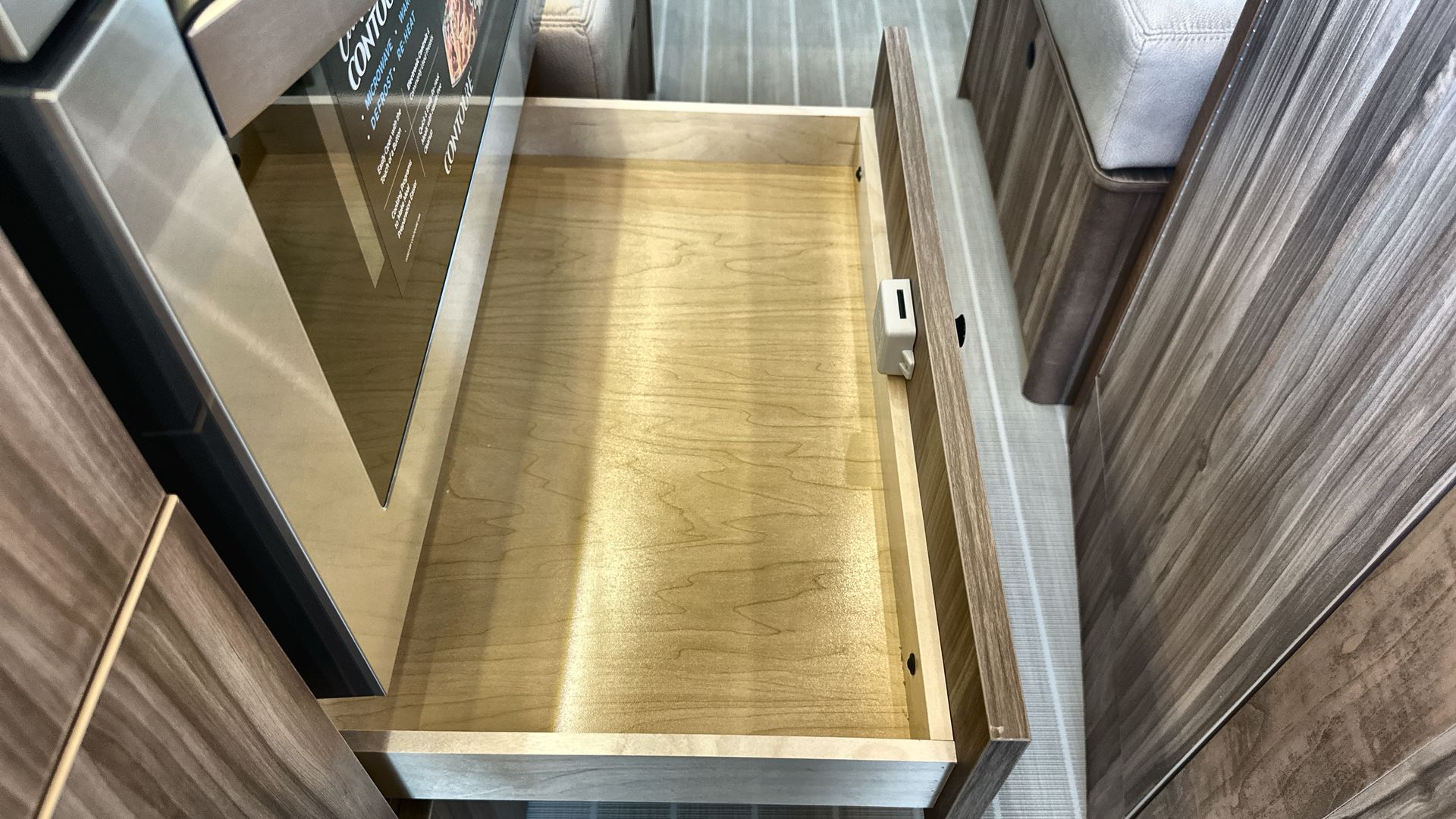 The European-style wet bath is designed for efficiency, featuring a shower, toilet, and sink in one versatile space. Additional amenities include a built-in bar cabinet for storing wine and spirits, power day/night window shades, and an LED widescreen HDTV for entertainment.
