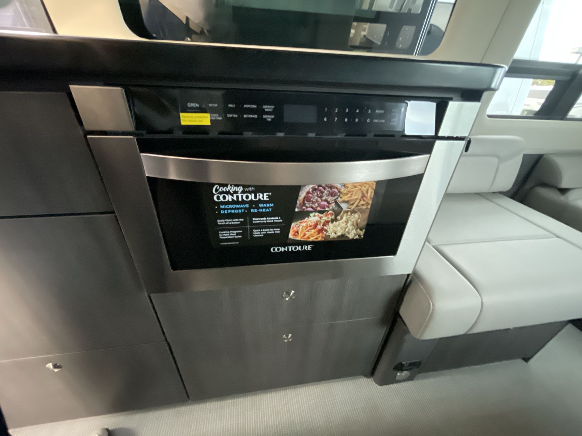 Inside, the 24GT is thoughtfully designed to maximize space and comfort. High-quality, durable upholstery covers the seating, including swivel captain's chairs that enhance the driving experience. The well-equipped kitchenette features a sleek countertop, two-burner gas stove, microwave, and compact refrigerator, making meal preparation on the go a breeze.