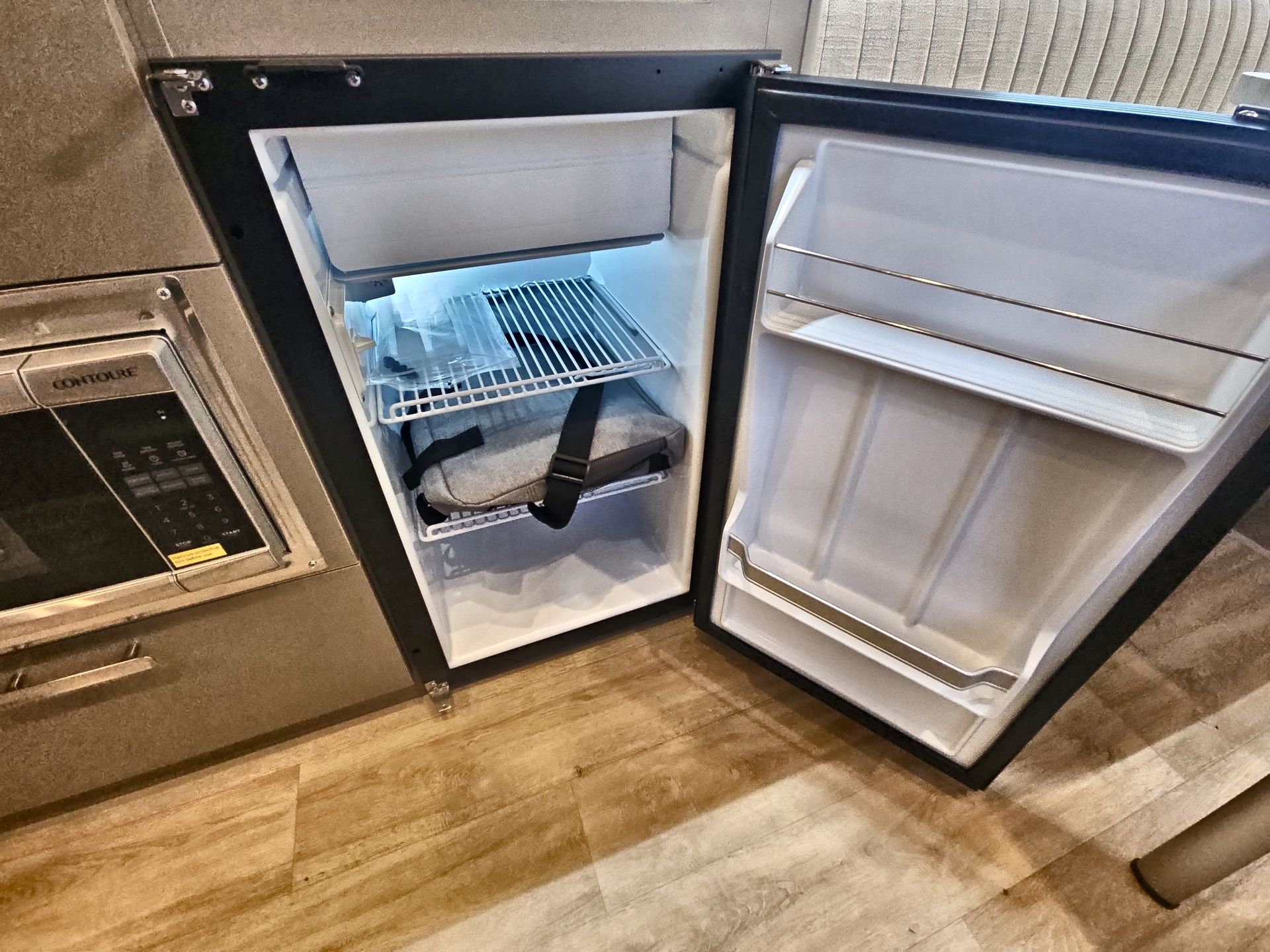 Inside, the Caravel 16RB is thoughtfully designed to maximize space and comfort. The rear bedroom features a 48" x 78" double bed with ample storage underneath, providing a cozy retreat after a day of exploration. The dinette area comfortably seats four and can be converted into an additional sleeping space measuring 40" x 91", accommodating up to four people in total. The kitchen is equipped with a two-burner stove, microwave, and a 3.1 cu. ft. 12V electric refrigerator, along with elegant cabinetry that offers plenty of storage for food and utensils. The bathroom includes a European-style wet bath with a shower, toilet, and sink, designed for efficient use of space.