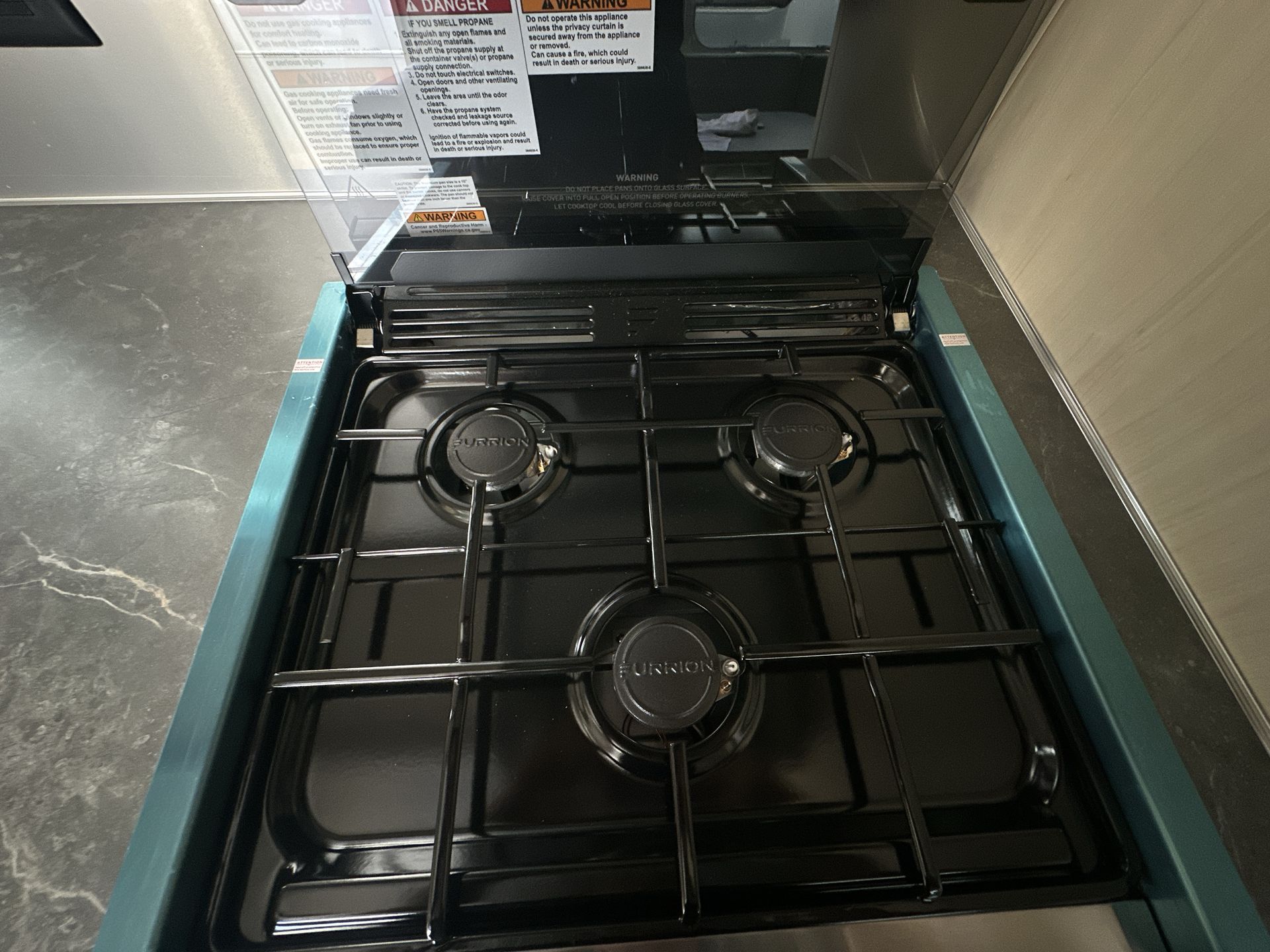 The kitchen is equipped with modern appliances, including a three-burner gas stove, oven, microwave, and a 6.8 cubic foot refrigerator with a freezer compartment. The stainless steel sink comes with a cutting board cover, providing extra counter space when needed. Ample storage options, such as upper and lower cabinets, ensure that all cooking essentials are within easy reach.