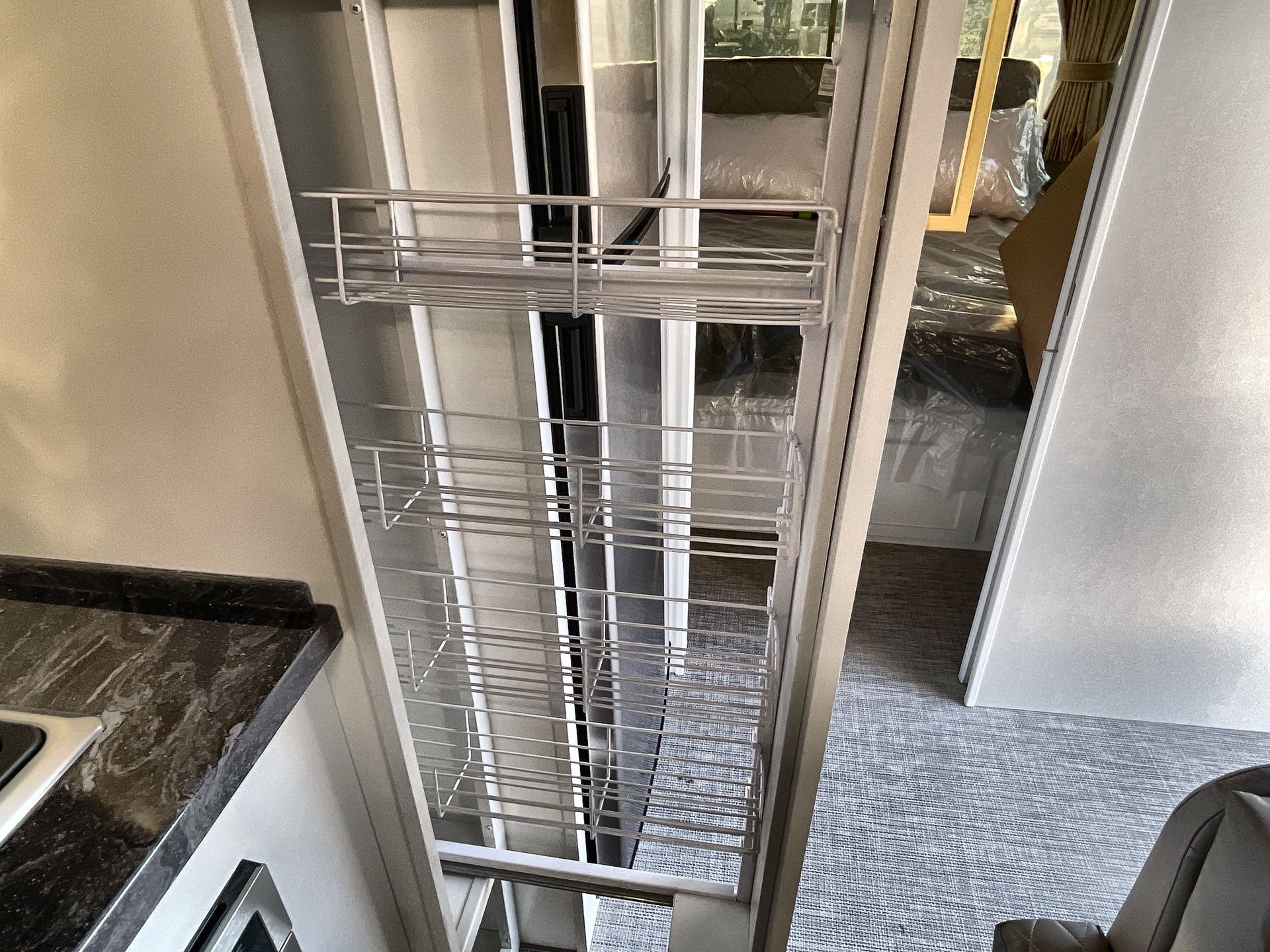 The bathroom spans the entire rear of the trailer and includes a spacious shower with a heated floor, a large vanity, a medicine cabinet, and a heated towel bar. These features add a touch of luxury to your daily routine.