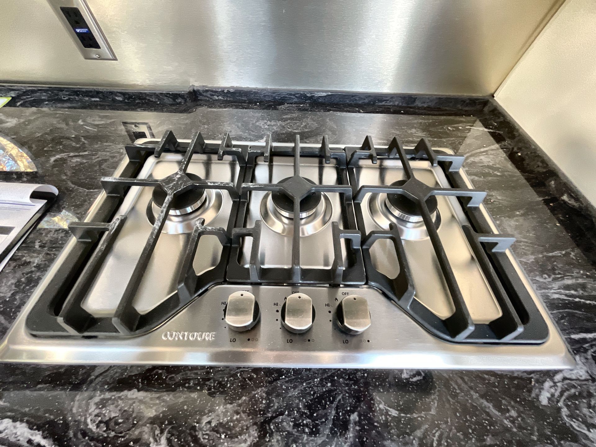 The kitchen is fully equipped with a stainless steel three-burner stove, oven, convection microwave, and a large refrigerator. Solid surface countertops and smart storage solutions make meal preparation easy and enjoyable.