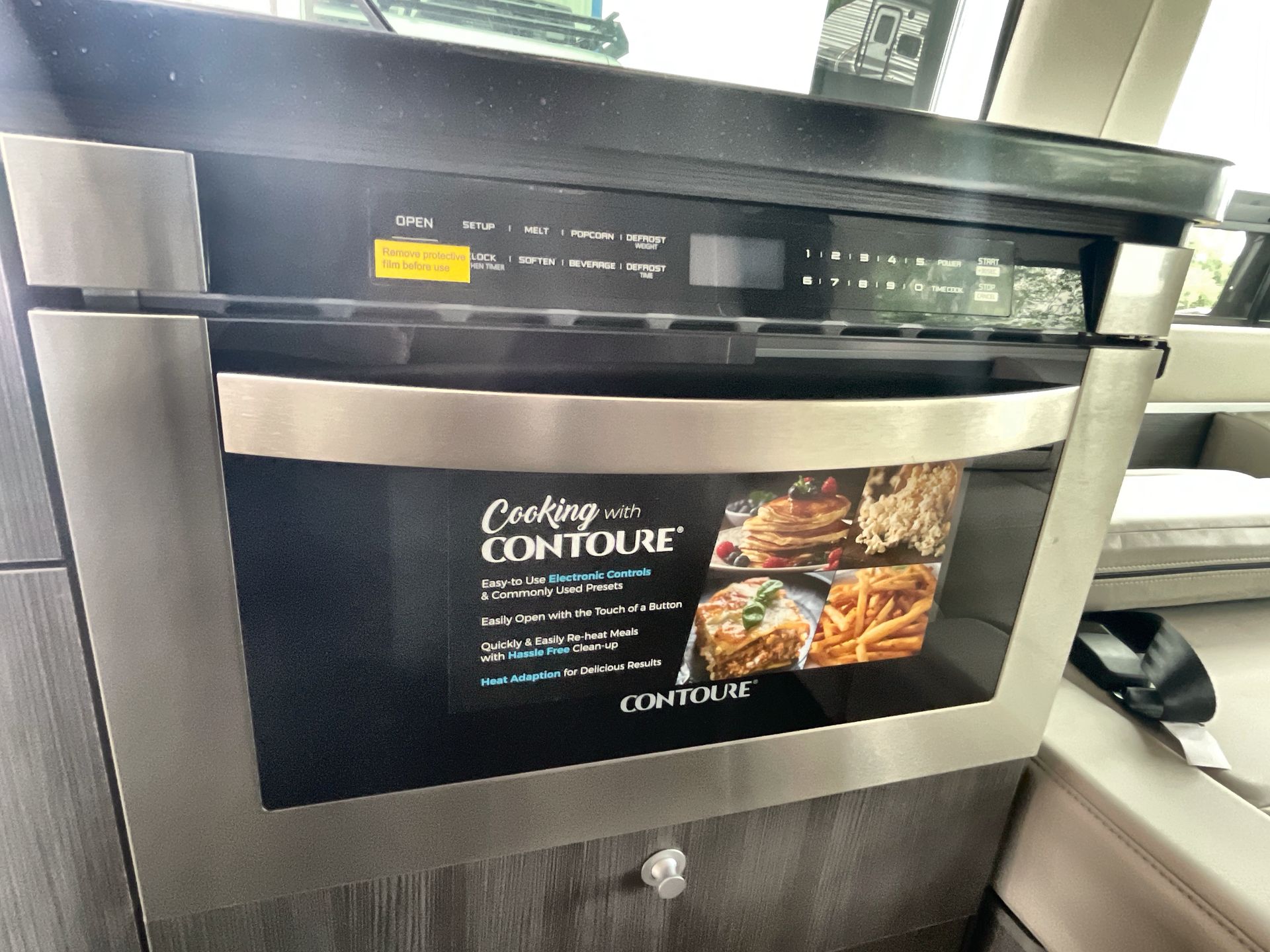 Inside, the 24GT is thoughtfully designed to maximize space and comfort. High-quality, durable upholstery covers the seating, including swivel captain's chairs that enhance the driving experience. The well-equipped kitchenette features a sleek countertop, two-burner gas stove, microwave, and compact refrigerator, making meal preparation on the go a breeze.